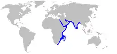 Pode ser encontrada em Barém, Djibuti, Egito, Eritreia, Índia, Irão, Iraque, Kuwait, Madagáscar, Moçambique, Omã, Arábia Saudita, África do Sul, Sudão, Emirados Árabes Unidos, Iémen e possivelmente na Somália.