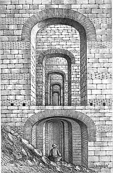 A principal estrutura consiste em 13 muros-contrafortes transversos, perfurados por três arcos de tijolos sobrepostos, que criaram 12 compartimentos, cada um com 9-13 metros de largura. As duas paredes longitudinais não são paralelas, mas se afastam a medida que vão para o norte.[7] O muro leste caracteriza-se por um par de corredores sobrepostos em seus dois níveis superiores, construídos dentro do corpo da muralha e iluminado por lacunas nas fachadas do muro. Os compartimentos do nível do porão não têm janelas, mas os níveis superiores são iluminados através de pequenas abertures no muro oeste.[8] Uma torre com escadaria em espiral conecta a principal estrutura com as duas torres.[9]