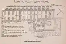 Inconsistências na colocação das janelas, que estão parcialmente cobertas pelas adições posteriores, bem como outras evidências de sucessivas alterações, mostram que a estrutura foi construída e modificada em fases separadas. O muro oriental da cidade veio primeiro, como uma simples muralha defensiva com galerias das quais flechas e outros projéteis poderiam ser atirados através das aberturas.[10] O resto da estrutura principal foi adicionada depois, provavelmente como um revestimento reforçado para a colina do palácio. O papel dos compartimentos é incerto; eles foram identificados como celas de prisão, o que levou a aplicação do nome "Prisão de Anemas" para a estrutura torda, mas tal hipótese não pode ser conclusivamente provada. É possível que funcionaram como armazéns ou (os dois níveis superiores ao menos) como quarteis.[11]
