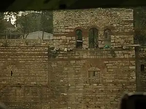 Quanto às torres, eles presumivelmente foram adicionadas depois, com a torre sul sendo mais antiga que a norte, uma vez que esta compartilha uma muralha que manifestamente pertence a anterior.[12] Isso, contudo, derruba sua identificação, respectivamente, como as torres de Isaac Ângelo e Anemas, pois a Torre de Anemas é registrada como já existindo nos primeiros anos do século XII do século XII, mais de 70 anos antes da construção da Torre de Isaac Ângelo.[13] Várias hipóteses foram introduzidas para dar conta disso. Uma teoria é que a identificação tradicional delas está invertida, ou que juntas constituem o mesmo edifício sob diferentes nomes. Outra propõe que a real Torre de Anemas fica mais ao norte e foi uma das torres da muralha de Heráclio.[14] Todas as teorias, contudo, contêm vários problemas, e a identificação tradicional permanece em uso padrão hoje.[15]