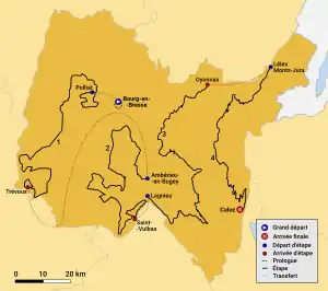 | Prólogo | 8 ago. | Bourg-en-Bresse – Bourg-en-Bresse | contrarrelógio individual | 3,8 | ||