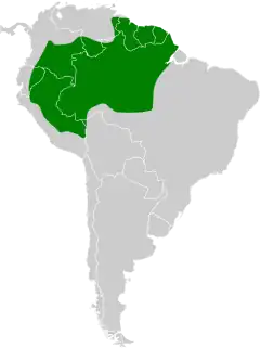 Pode ser encontrada nos seguintes países: Bolívia, Brasil, Colômbia, Equador, Guiana Francesa, Guiana, Peru, Suriname e Venezuela.[1]