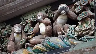 A fonte que popularizou esta máxima pictórica é uma escultura do século XVII sobre uma porta do famoso santuário Tōshō-gū em Nikkō, Japão. As esculturas no Santuário Tōshō-gū foram esculpidas por Hidari Jingoro, e acredita-se que tenham incorporado o Código de Conduta de Confúcio, usando o macaco como uma forma de representar o ciclo de vida do homem. Há um total de oito painéis, e a icônica imagem dos três macacos sábios vem do painel 2. A filosofia, no entanto, provavelmente veio originalmente para o Japão com uma lenda tendai-budista, da China no século VIII (Período Nara). Sugeriu-se que as figuras representam os três dogmas da chamada escola média da seita.