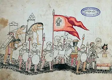 Expansão do império foi guiado por uma interpretação militarista da religião Nahua, especificamente a veneração do deus sol, Huitzilopochtli. Rituais do Estado militarista eram realizadas ao longo do ano de acordo com um calendário cerimonial de eventos, ritos e simulações de batalhas. O período de tempo em que viviam era chamado Ollintonatiuh (Movimento do Sol ou Quinto Sol) que acreditavam ser a idade final após a qual a humanidade seria destruída.[56] Foi sob o reinado de Tlacaelel que Huitzilopochtli assumiu seu papel no panteão do Estado e que se instituiu que seria através de sacrifício de sangue que o Sol se manteria e, dessa forma, poderia se evitar o fim do mundo. Foi sob essa nova interpretação, militarista do Huitzilopochtli que os soldados astecas foram encorajados a lutar nas guerras e os soldados inimigos capturados para o sacrifício. Embora o sacrifício de sangue fosse comum na Mesoamérica, a escala de sacrifício humano com os astecas foi provavelmente sem precedentes na região.[57]