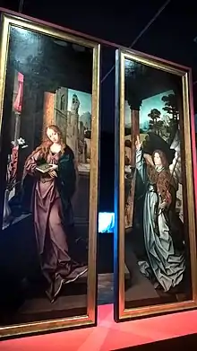 As duas pinturas da Anunciação também apresentam um fundo unificado, com o Arcanjo e a Virgem Maria representados no interior de uma varanda que se abre para uma paisagem de grande profundidade. A construção arquitectónica permite compensar a grande verticalidade dos painéis, numa composição harmónica em que o dinamismo das figuras é dado pelo movimentado das suas vestes.[4]