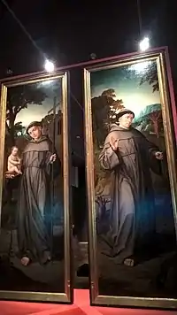 Os dois painéis laterais anversos representam portanto S. Francisco e S. António. S. Francisco está representado com as suas chagas e o crucifixo vendo-se também o serafim que o estigmatizou. S. António sustenta na mão direita o Livro sobre o qual está sentado o Menino Jesus nu que segura por sua vez uma açucena, e com a mão esquerda prende uma belíssima cruz em ourivesaria.[2]