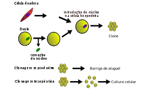 O núcleo de uma célula somática é removido da célula doadora, e o restante da célula é descartado. Ao mesmo tempo, o núcleo do óvulo receptor também é removido. O núcleo da célula somática doadora é introduzido no óvulo e, então, o padrão de expressão do núcleo é reprogramado pela célula hospedeira. O óvulo sofre um estimulo elétrico e começa a se dividir. Depois de vários ciclos de divisão celular, estas células formam um blastocisto (um estágio inicial da embriogênese) e um embrião normal se desenvolverá.