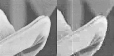 No entanto, em geral pixels vizinhos são altamente correlacionados. A correlação entre pixels vizinhos que tenham sido alocados em blocos diferentes é, entretanto, ignorada no processamento. A segmentação arbitrária da imagem original pode fazer com que apareçam descontinuidades na imagem resultante (ver figura ao lado).