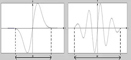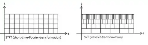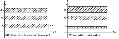 Em outras palavras, a função básica pode ser considerada como uma resposta ao impulso de um sistema com o qual a função foi filtrada. O sinal transformado fornece informações sobre o tempo e a frequência. Portanto, a transformada wavelet contém informações semelhantes à transformação de Fourier de curto prazo (STFT, ou Short-Time-Fourier-Transformation, em inglês), porém com propriedades especiais adicionais das onduletas. Essas propriedades aparecem na resolução temporal em frequências de análise mais altas da função-base. A diferença na resolução de tempo em frequências crescentes para a transformada de Fourier e a transformada wavelet é mostrada abaixo. Observe, entretanto, que a resolução da frequência está diminuindo para frequências crescentes, enquanto a resolução temporal aumenta. Esta consequência do princípio da incerteza de Fourier não é exibida corretamente na Figura.