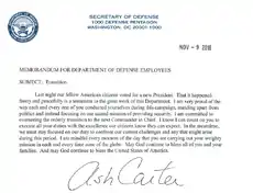 - «Secretary of Defense Ash Carter sends memo to staff demanding peaceful transition of power». The Week. 9 de novembro de 2016