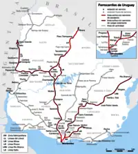 A rede ferroviária do Uruguai possui 2,993 km de extensão total, sendo totalmente em bitola internacional (1435 mm), embora somente 1640,9 km sejam utilizados atualmente. É divido em 6 grandes linhas ,além de pequenos ramais industriais. Possui conexões com a Argentina e o Brasil, sendo administrado atualmente pela empresa estatal Administración de Ferrocarriles del Estado.