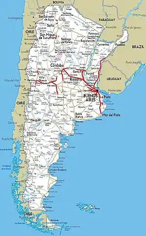 O transporte da Argentina é baseado principalmente em uma complexa rede de rotas, atravessada por longa distância, relativamente composta por ônibus e por caminhões de carga. O país também tem um considerável número de aeroportos nacionais e internacionais. A importância do transporte ferroviário é menor atualmente, embora, no passado, foi amplamente utilizado e agora recupera impulso após a renacionalização das redes de transporte regional e de mercadorias do país.[1][2] O transporte fluvial é usado principalmente para a movimentação de cargas.