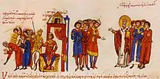 - [a] ^ O juramento pagão búlgaro tinha um significado simbólico profundo. O derramamento de água foi um lembrete que se o juramento é quebrado, sangue seria derramado. No mesmo sentido foi explicado o girar da sela - um aviso que o infrator não seria capaz de andar e cairia morte de seu cavalo durante batalha. A rédea tripla simbolizava a resistência do acordo e o levantamento da grama lembra que não grama sobraria no país inimigo se a paz fosse quebrada. O sacrifício de cães foi um costume comum entre os povos turcos que fortaleceu ainda mais o tratado.[4]