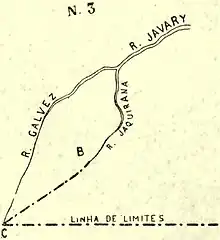 O tratado, de 27 de março de 1867, diz que a fronteira entre o Madeira e o Javari seria constituída pelo Paralelo 10°20’ Sul ou se o Javari tivesse as suas nascentes ao Norte desse Paralelo, por uma reta tirada do ponto em que começa o Madeira, até a nascente principal do Javari.[13]