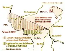 Contudo, a manutenção da escolha pela Linha Cunha Gomes e a desconsideração da população brasileira já residente abaixo dela, levaria, anos mais tarde, à Questão do Acre e a necessária intervenção do Barão do Rio Branco, que, por sua vez, também interpretava que o correto seria a fronteira passar pelo Paralelo 10°20’ .[18] Em suas palavras: Para a determinação dos limites, no Tratado de 1867, adotou-se a base do uti possidetis, a mesma sobre a qual foram assentados todos os nossos ajustes similares com as repúblicas vizinhas, e, em vez de procurar fronteiras naturais ou arcifínias seguindo a linha do divortium aquarum que nos deixaria íntegros todos os afluentes do Solimões, entendeu-se, com vantagem para a Bolívia, que o direito resultante da posse ou das zonas de influência dos dois povos podia razoavelmente ficar demarcado pelo paralelo da confluência do Beni e Mamoré, isto é, pelo de 10º20’S desde esse ponto, a leste, até o Javari, a oeste, cuja nascente se supunha estar em latitude mais meridional. Por isso, o artigo 2o, no seu penúltimo parágrafo, estabeleceu a fronteira por essa linha paralela ao Equador, e no seguinte empregou a expressão “linha leste-oeste”. Como, porém, o último parágrafo, figurando a hipótese de se achar a nascente do Javari “ao norte daquela linha leste-oeste”, diz que, nesse caso, “seguirá a fronteira, desde a mesma latitude, por uma reta, a buscar a origem principal do dito Javari”. Sem, entretanto, precisar o ponto inicial da segunda linha na referida latitude de 10º20’S, adotou-se oficialmente desde dezembro de 1867 a opinião de que a fronteira devia ir por uma oblíqua ao Equador desde a confluência do Beni até a nascente do Javari, de sorte que a linha do uti possidetis, que, pelo tratado era leste-oeste, passou a ser deslocada, com prejuízo nosso, dependendo a sua exata determinação do descobrimento de um ponto incógnito, como era então a nascente do Javari.[18]