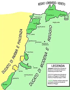 - Por sua vez, o Ducado de Parma cederia os territórios do ex-ducado de Guastalla (Guastalla, Luzzara e Reggiolo)[c] ao ducado de Módena, em compensação pela renúncia de Pietrasanta e Barga.