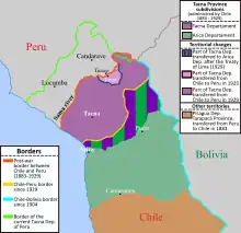 Mapa explicando a controvérsia de Tacna e Arica (1883-1929) entre Chile e Peru.