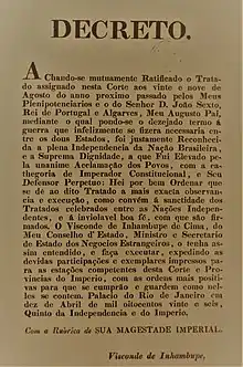 Consumada a independência do Brasil, era necessário dar-lhe suporte legal, obter o reconhecimento da independência por outras nações e firmar um diploma sobre os termos da cessação da soberania portuguesa e o reconhecimento do Brasil como nação soberana. No entanto, permanecia em Portugal a crença em restabelecer com o Brasil os antigos laços, sobretudo após a abolição do regime constitucional, a dissolução da Cortes e a assunção por D. João VI de todas as suas prerrogativas.
