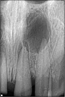 A necrose pulpar geralmente ocorre como necrose isquêmica (infarto) causada pela interrupção do suprimento sanguíneo no forame apical ou como necrose liquefativa relacionada à infecção após trauma dentário. Os sinais de necrose pulpar incluem:[53]