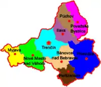 A região de Trenčín está dividida em 9 distritos (eslovaco: okresy) e 274 municípios (obce):
