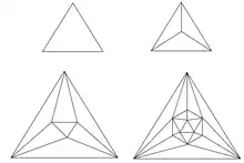 É possível dividir um triângulo[6] em outros menores internos de modo que em cada vértice incida o mesmo número de segmentos. Sendo t a quantidade de triângulos e v o número de vértices. Em cada vértice incide uma quantidade y de segmentos. é a soma dos ângulos internos; é a soma dos ângulos em cada vértice no interior do triângulo. A soma dos ângulos internos do triângulo é 180 graus. Então