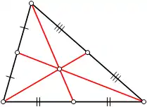 O ponto de interseção das três medianas é o baricentro ou centro de gravidade do triângulo. O baricentro divide a mediana em dois segmentos.[3] O segmento que une o vértice ao baricentro vale o dobro do segmento que une o baricentro ao lado oposto deste vértice. No triângulo equilátero, as medianas, mediatrizes, bissetrizes e alturas são coincidentes.[2] No isósceles, apenas as que chegam ao lado diferente, no escaleno, nenhuma delas. Ainda para o triângulo Isósceles, vale ressaltar que a formação da bissetriz, coincidindo com o ponto médio de sua base, divide três semirretas iguais, as quais são percebidas com a inscrição do círculo formado pelo incentro da bissetriz, onde há duas semirretas, as quais serão o raios do círculo, sendo assim, dividindo-se em três partes iguais a altura do triângulo (que também coincide com a mediana e a bissetriz, cada ), explicam-se as relações de a semirreta que parte do ponto central do círculo até o lado do triângulo valer o mesmo que o raio, isto é, e que o resto até o vértice oposto a esse lado valer