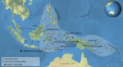 O Triângulo de Coral é uma área aproximadamente triangular das águas marinhas tropicais da Indonésia, Malásia, Papua-Nova Guiné, Filipinas, Ilhas Salomão e Timor-Leste que contêm pelo menos 500 espécies de corais construtores de recifes em cada ecorregião . Esta região abrange partes de duas regiões biogeográficas: a região da Indonésia-Filipinas e a região do extremo sudoeste do Pacífico. O triângulo de coral é reconhecido como o centro global da biodiversidade marinha e uma prioridade global para a conservação. Também é chamada de " Amazônia dos mares" e cobre 5,7 milhões de quilômetros quadrados (2.200.000 milhas quadradas) de águas oceânicas.[1] Seus recursos biológicos sustentam a vida de mais de 120 milhões de pessoas. Segundo a Rede de Conhecimento do Triângulo de Coral , cerca de US$3 bilhões em exportações pesqueiras e outros US$ 3 bilhões em receitas de turismo costeiro são derivados como receita anual de câmbio na região.[2]