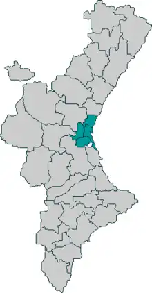 Antes do rio Túria desembocar ao sul da cidade de Valência, as suas águas são repartidas entre oito canais de irrigação principais que vão até os campos de cultivo. Cada um desses canais de irrigação, de fato, é um sistema hidráulico próprio (na margem esquerda: Montcada, Tormos, Mestalla e Rascanya; na margem direita: Quart, Mislata, Favara e Rovella).