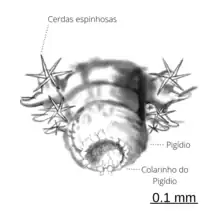 Na região anterior, há as cerdas como espinhos protráteis, que, e quando exteriorizadas, e este processo é irreversível, formam um estrutura radiada.[8]