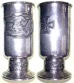 A primeira versão - mais antiga e mais preciosa - foi feita em prata maciça, enquanto a segunda - mais recente - em prata níquel, devido à escassez de mais metal precioso à medida que as operações de guerra prosseguiam. Ambos os cálices têm no fundo as iniciais da empresa em letras maiúsculas latinas - JOH.WAGNER & SOHN - e respectivamente para o artefato de prata o título do metal - 835 - e outras três marcas registradas da empresa, ou para o artefato em prata de níquel a escrita elipsoidal em letras maiúsculas latinas FEINSILBER ALPAKA AUFLAGE.[9]