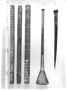 - Este artigo foi inicialmente traduzido, total ou parcialmente, do artigo da Wikipédia em inglês cujo título é «Tutankhamun's trumpets».