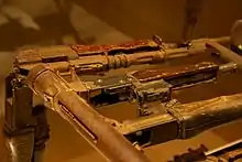 Na frente da cadeira encontra-se uma espingarda AKM fabricada pela Coreia do Norte, e uma metralhadora ligeira PPS-43, e as armas que compõem o assento foram fabricadas na Polónia e Checoslováquia.[4]