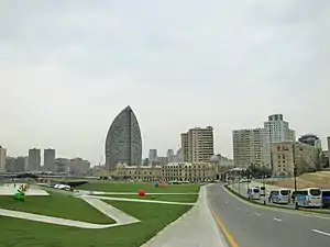 O projeto foi anunciado como um prédio de apartamentos em 2008, a ser construído ao longo de uma estrada chamada Heydar Aliyev Prospekti, em Baku, Azerbaijão. Grande parte da propriedade do novo projeto foi ocupada por inúmeras casas. O orçamento original do projeto era de US$ 195 milhões, embora o preço tenha aumentado após várias revisões de design. O projeto foi inicialmente projetado por um arquiteto local, e seu design original incluía um telhado semelhante aos espigões de uma coroa.[2] Pierre Baillargeon e Mixity Design,[1] sua empresa de arquitetura com sede em Londres, redesenharam o projeto e removeram o aspecto do teto da coroa. A estrutura foi projetada como um edifício curvo para se parecer com uma vela, semelhante ao Burj Al Arab em Dubai.