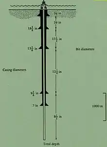 Com a profundidade do conjunto de revestimento determinada, tamanhos de perfuração e tamanhos de revestimento devem seguir. A perfuração para cada coluna de revestimento deve ser suficientemente largo para caber facilmente o revestimento em seu interior, permitindo espaço para o cimento entre o exterior do revestimento e a perfuração. Além disso, o diâmetro interior da primeira coluna de revestimento deve ser suficientemente grande para caber a segunda broca que irá continuar a perfuração. Assim, cada coluna de revestimento irá ter um diâmetro subsequentemente menor.