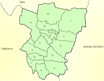 Província de Tucumã, divisão política e sua capital. La numeração é correspondente à lista
