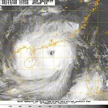 O tufão Hagupit em 23 de setembro, aproximando-se da China, perto de seu pico de intensidade. | |