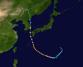 Mais tarde naquele dia, o sistema saiu do PAR e o PAGASA divulgou seu último boletim sobre o tufão.[11] À medida que o sistema continuou sua trajetória para o norte em direção ao arquipélago japonês, continuou a enfraquecer e se tornou um tufão de categoria 3 quando Haishen fez outro ciclo de substituição da parede do olho, e não muito tempo depois que caiu para um tufão de categoria 2 ao se aproximar das Ilhas Ryūkyū do Sul de Japão. Uma ordem de evacuação obrigatória foi emitida para o oeste do Japão, conforme milhões de pessoas evacuaram em conformidade.[8] Haishen atingiu a costa em Ulsan, Coreia do Sul por volta das 09:00 KST (00:00 UTC) em 7 de setembro,[12] com ventos sustentados máximos de 10 minutos em 140 km/h (87 mph) e a pressão central em 955 hPa (28.20 inHg). Pouco depois, Haishen entrou no Mar do Japão como uma tempestade tropical de ponta; devido às baixas temperaturas da superfície do mar, Haishen enfraqueceu rapidamente e fez landfall na província de Hamgyong do Sul, Coreia do Norte, com ventos sustentados de 100 minutos no máximo de 10 minutos. km/h (65 mph) e uma pressão central de 980 hPa (28,94 inHg).[13] Logo depois, o JTWC emitiu seu aviso final sobre Haishen, enquanto se movia mais para o interior na Coreia do Norte.[14] Às 18:50 UTC, o JMA emitiu seu último comunicado sobre Haishen, e declarou-o uma baixa extratropical ao se mover perto da fronteira entre a China e a Coreia do Norte.[13]
