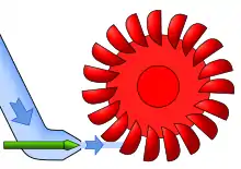 Nas turbinas Pelton não há palhetas estáticas e sim um conjunto de bocais ou injectores, cada qual com uma agulha móvel (semelhante a uma válvula) para controlar a vazão. Nessas turbinas, a pressão da água é primeiro transformada em energia cinética pelo bocal, que acelera a água até uma alta velocidade. O jato d'água é dirigido para uma série de conchas curvas montadas em torno do rotor.