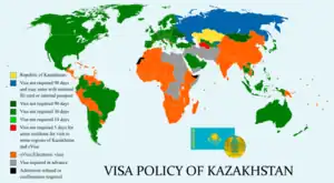 O Cazaquistão oferece um regime de isenção de visto permanente por até 90 dias para cidadãos da Armênia, Bielorrússia, Geórgia, Moldávia, Quirguistão, Mongólia, Rússia e Ucrânia e por até 30 dias para cidadãos da Argentina, Azerbaijão, Sérvia, Coreia do Sul, Tajiquistão, Turquia e Uzbequistão.[15]