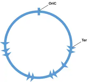 O genoma da E. coli possui dez sítios da ligação à proteína Tus, denominados TerA, TerB, Ter C, e assim sucessivamente até TerJ. As proteínas Tus ligadas a estes sítios bloqueiam a forquilha de replicação que avança em um sentido mas não no outro. Desse modo, os complexos Tus-Ter funcionam como válvulas flanqueando uma região na qual as forquilhas de replicação podem entrar mas não sair (Figura), sincronizando a convergência das duas forquilhas de replicação em um ponto de terminação específico. [2][4]