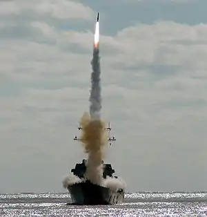 O USS Bainbridge disparando um míssil tomahawk.