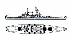 | Armamento | 9 canhões de 406 mm 20 canhões de 127 mm 16 canhões de 28 mm 18 metralhadoras de 12,7 mm |