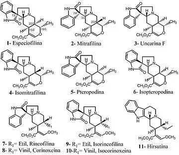 Os alcalóides pentacíclicos oxindólicos possuem atividade imunomoduladora e imunoestimulante, o que contribui no combate à AIDS e a anti amiloidose, implicada na doença de Alzheimer (LIMA et al., 2019). Os alcalóides oxindólicos tetracíclicos também têm sido alvo de pesquisas, como a hirsutina, hirsuteina, corinanteína e dihidrocorinanteína. O alcalóide que tem sido mais pesquisado é a hirsutina, e descobriu-se que ela é um potente antiviral, que tem ação relaxante na musculatura lisa, o que ajuda na redução da pressão arterial, também foram observadas atividades antiespasmódica, antiarrítmica, anticonvulsivante,protetora da mucosa gastrointestinal e analgésica. Os outros alcalóides indólicos tetracíclicos demonstraram possuir propriedades semelhantes (MARQUES, 2008).[42],>
