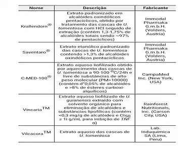 Marques (2008) afirma que a maior parte dos estudos e das preparações comerciais são feitas a partir dos alcalóides oxindólicos. Porém existem poucos estudos que testam os alcalóides pentacíclicos isolados.Honório et al. (2016) diz que os dois diferentes quimiotipos da U. tomentosa, que possuem alcalóides tetracíclicos e pentacíclicos são antagônicos. Os alcalóides oxindólicos tetracíclicos atuam de forma predominante no sistema nervoso tanto central quanto periférico e estudos mostram que seus efeitos sobre outros sistemas podem ser antagônicos aos efeitos dos alcalóides pentacíclicos.
