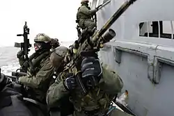 Durante a Batalha de Basra,[185] os SEALs, juntamente com a Brigade Patrol Troop e o 539 Assault Squadron RM, tentaram uma abordagem marítima para Basra através da hidrovia Shatt al-Arab, mas foram interceptados por embarcações de patrulha da Guarda Revolucionária Iraniana e não queriam enfrentá-los, então eles se retiraram. Em 6 de abril de 2003, depois de se mudarem mais acima na hidrovia, eles se infiltraram com sucesso pela hidrovia, usando Unmanned Aerial Vehicle (UAVs) que chamaram de "demonstração de força" e um ataque aéreo de um USMC Harrier contra as tropas iraquianas, os SEALs então se dirigiram para a casa de Chemical Ali's com equipes SSE para encontrar vestígios de armas químicas.[181] Os SEALs realizaram missões em torno de Nasiriyah, realizando reconhecimento nas aldeias vizinhas e enfrentando pontos fortes inimigos ignorados pelo avanço da Marinha dos EUA. Pelotão Charlie, SEAL Team 3, mais tarde operou à frente do avanço da Marinha, realizando missões semelhantes.[182] As unidades SEAL e GROM continuaram a cooperar durante o resto da fase de invasão, com ataques e missões anti-atiradores em Bagdá.[118]