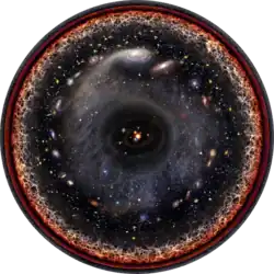 O universo observável é uma região em forma esférica do Universo que compreende toda a matéria que pode ser observada da Terra ou de seus telescópios espaciais e sondas exploratórias na atualidade, porque a radiação eletromagnética desses objetos teve tempo de chegar ao Sistema Solar e à Terra desde o início da expansão cosmológica. Pode haver 2 trilhões de galáxias no universo observável,[8][9] embora esse número tenha sido estimado recentemente em apenas várias centenas de bilhões com base em novos dados da New Horizons.[10][11] Supondo que o universo seja isotrópico, a distância até a borda do universo observável é aproximadamente a mesma em todas as direções. Ou seja, o universo observável possui um volume esférico (uma bola) centrado no observador. Cada local no universo tem seu próprio universo observável, que pode ou não se sobrepor ao que está centrado na Terra.