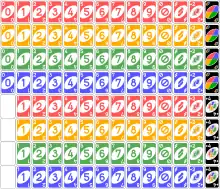 | Reverter (Representada por duas setas curvadas, uma de cabeça para cima e outra de cabeça para baixo, uma em cima da outra) | A ordem do jogo é invertida, do sentido horário para o sentido anti-horário e vice-versa. Se o jogo for jogado por duas pessoas, a carta é tratada com o mesmo sentido de pular. |