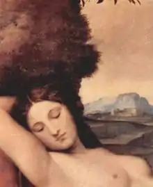 O morro que se vê com casas do lado direito é muito similar ao de Noli me Tangere de Ticiano spazial. Como foi confirmado pela análise de infravermelhos, Ticiano reduziu o lençol e ampliou o manto erboso e acrescentou o pano vermelho.Deste é também a massa rochosa escura por trás da cabeça da mulher, o que dá a ideia de uma ravina em que a mulher descansa. Também tratou o céu e a paisagem, que a partir daí passou a fazer parte do seu repertório, pois é do mesmo tipo aplicado também em Noli Me Tangere de Londres e em Amor sacro e amor profano.[3]