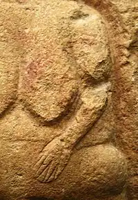 Por outro lado, os famosos baixo-relevos provinham de níveis gravettenses e solutreanos antigos, que ocupavam o teto da seqüência e iam acompanhados por indústria lítica e óssea (pontas de entalhe, lâminas com retoque inverso…). Os relevos incluem representações de vários animais e cinco com antropomorfos, um representava a um homem itifálico de aspeto confuso e fantasmal (muito parecido às gravuras de Roc-de-Sers) e os outros quatro são mulheres, entre eles a famosa vênus e outra que parece o seu enantiomorfa (imagem especular), em pior estado, que foi roubada e vendida ilegalmente ao Museu de Berlim. Esta figura também parece suster um corno de bisão, embora seja mais duvidoso. Assim pois, a idade da «Mulher com Corno» está entre o final do Gravetense e a transição ao Solutreano, é dizer, o que denominaríamos «Inter-graveto-solutreano». Esta datação é a mesma que as vênus de Kostienki, Willendorf ou Lespugue.