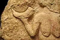Segundo Leroi-Gourhan estaríamos ante dois símbolos complementares femininos, o bisão e as mulheres, o homem.[2] Outras interpretações mais tradicionais, por outro lado, relacionam à «Mulher com Corno» de Laussel com uma deusa da fertilidade, na qual o corno representaria a cornucópia da abundância, as covinhas da menstruação simbolizariam o ciclo lunar relacionados com o ciclo mentrual pois ela segura em uma mão um corno de bisão em forma de lua crescente, enquanto a outra aponta para seu ventre. As treze incisões feitas no corno referem-se à passagem dos meses lunares. A relação entre a gravidez, que ocorre em 10 lunações e o ciclo lunar/menstrual, em 13 lunações, evidencia para muitos estudiosos, um dos primeiros registros da interação entre os clicos do Universo e os ciclos humanos.[3][4] .[5]